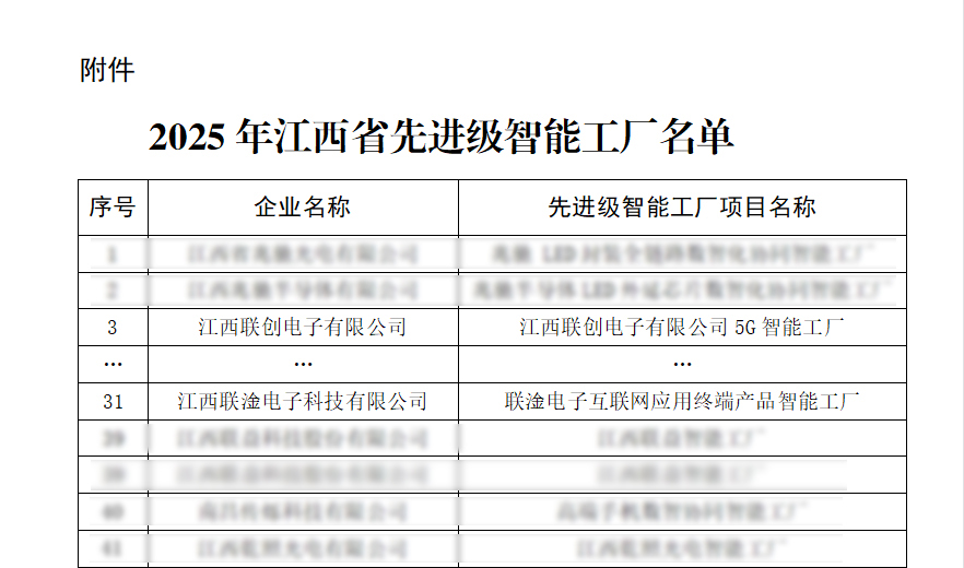 近日,江西省工业和信息化厅正式公布2025年江西省“先进级智能工厂”名单,186家企业入选。其中九游平台,九游(中国)、江西联淦电子科技有限公司2家联创电子系企业名列榜单。这标志着公司在智能制造领域的创新成果再次获得政府权威认可。